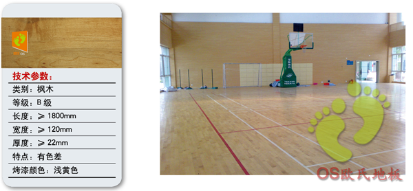 用此品種鋪裝地面,舒適、溫暖、明亮、大方。能完全滿足運動員對體育運動、籃球、羽毛球、網球、排球、乒乓球、壁球、舞臺演出、舞蹈、健身等競技項目的訓練和比賽,體育運動木地板工程的設計在結構上除滿足體育競技和健身需求外,在選用材料上體現自然環保,在設計上還體現自然、和諧、時尚體育木地板是一種具有優良的承載性能,高吸震性能,抗變形性能的運動木地板,其表面的摩擦系數達到0.4-0.6太滑或太澀都會對運動員造成傷害。震動吸收性能達到了≥53%可有效的避免運動員受到運動損傷,而作為籃球場的體育木地板,還具有90%以上的球體反彈能力,能有效滿足運動快節奏需求。